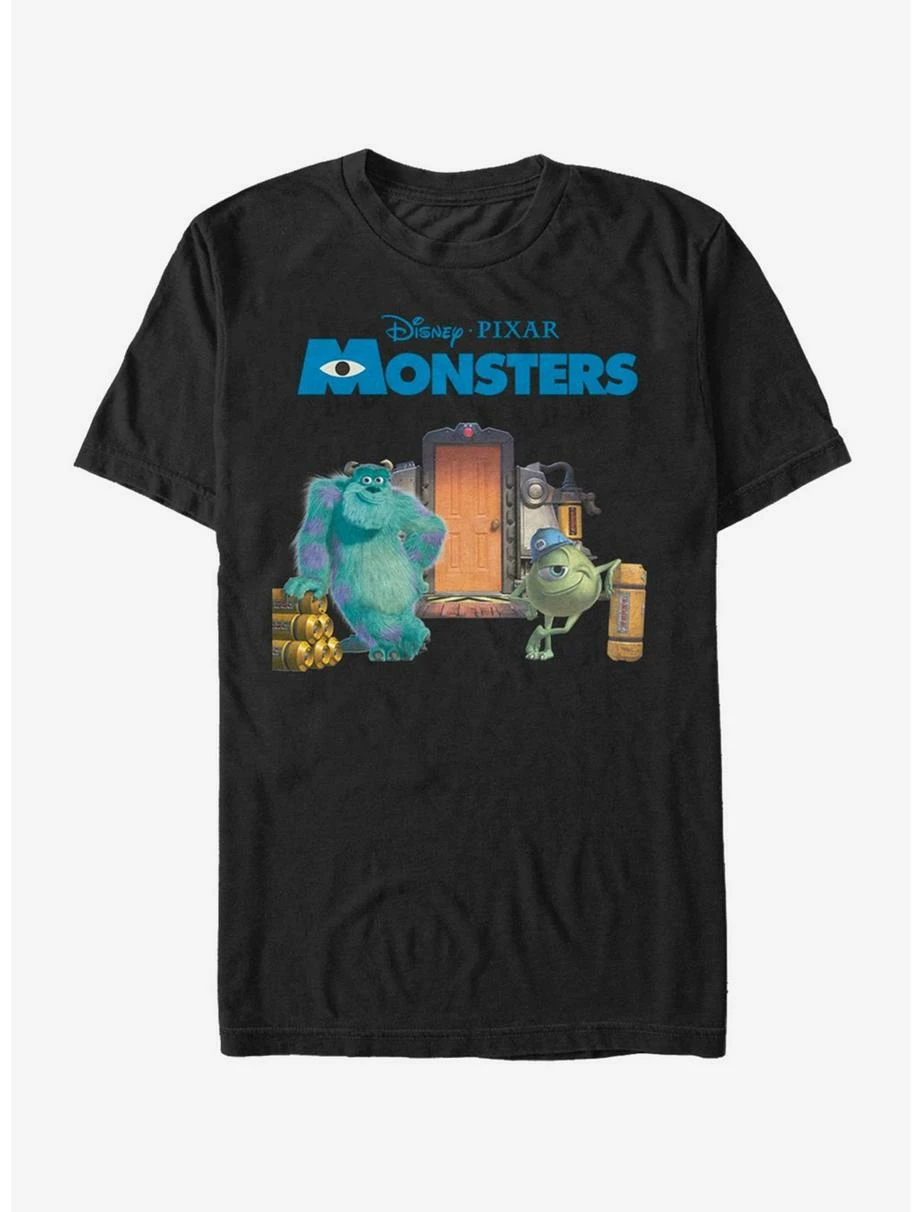 Throw on your Monsters Inc. Mike and Sulley Scream Factory Black T-Shirt and head to the office for a day of scaring! Mike and Sulley are featured standing next to a closet door portal and holding scream energy canisters on this awesome black Monsters Inc. shirt. 100% Cotton.