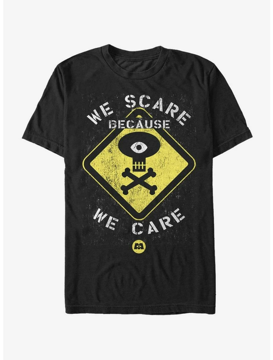 Head to the Monstropolis scream-powered energy plant with the Monsters Inc. We Scare Because We Care Sign Black T-Shirt. A distressed yellow and white print reads “We Scare Because We Care” alongside a warning sign with a one-eyed skull and crossbones symbol on this black Monsters Inc. shirt. 100% Cotton.