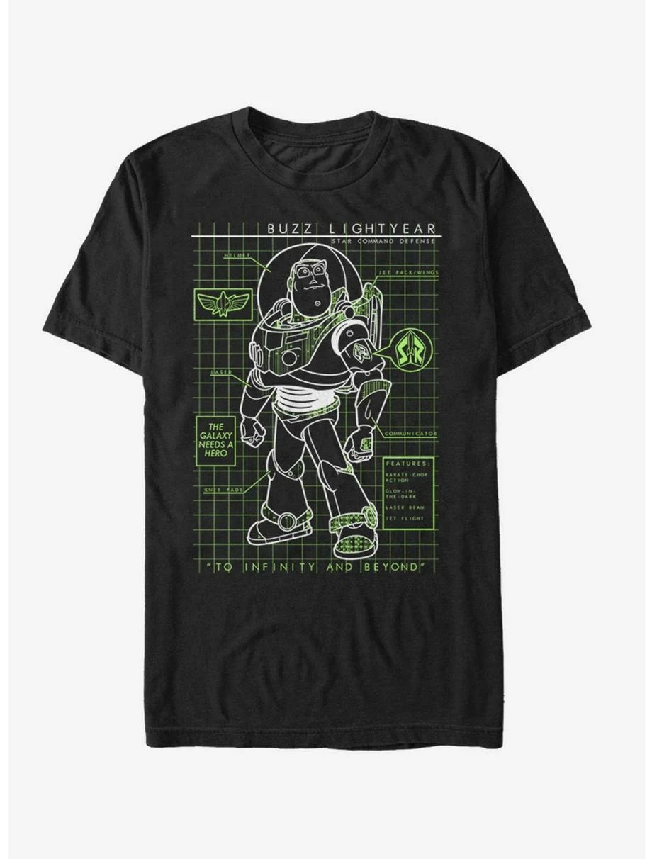 Go to infinity and beyond with the Toy Story Buzz Lightyear Diagram Black T-Shirt! A schematics-style print on the front of this awesome black Toy Story shirt feature Buzz Lightyear with all his features listed in detail including his laser and karate-chop action. 100% Cotton.