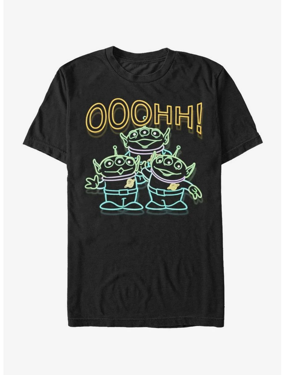Ooohh, is that the claw!? Nope, it’s the Toy Story Squeeze Toy Aliens Black T-Shirt! Three aliens are printed in the style of neon lights with “Ooohh!” above them on this black Toy Story shirt. This shirt does not light up or glow. 100% Cotton.