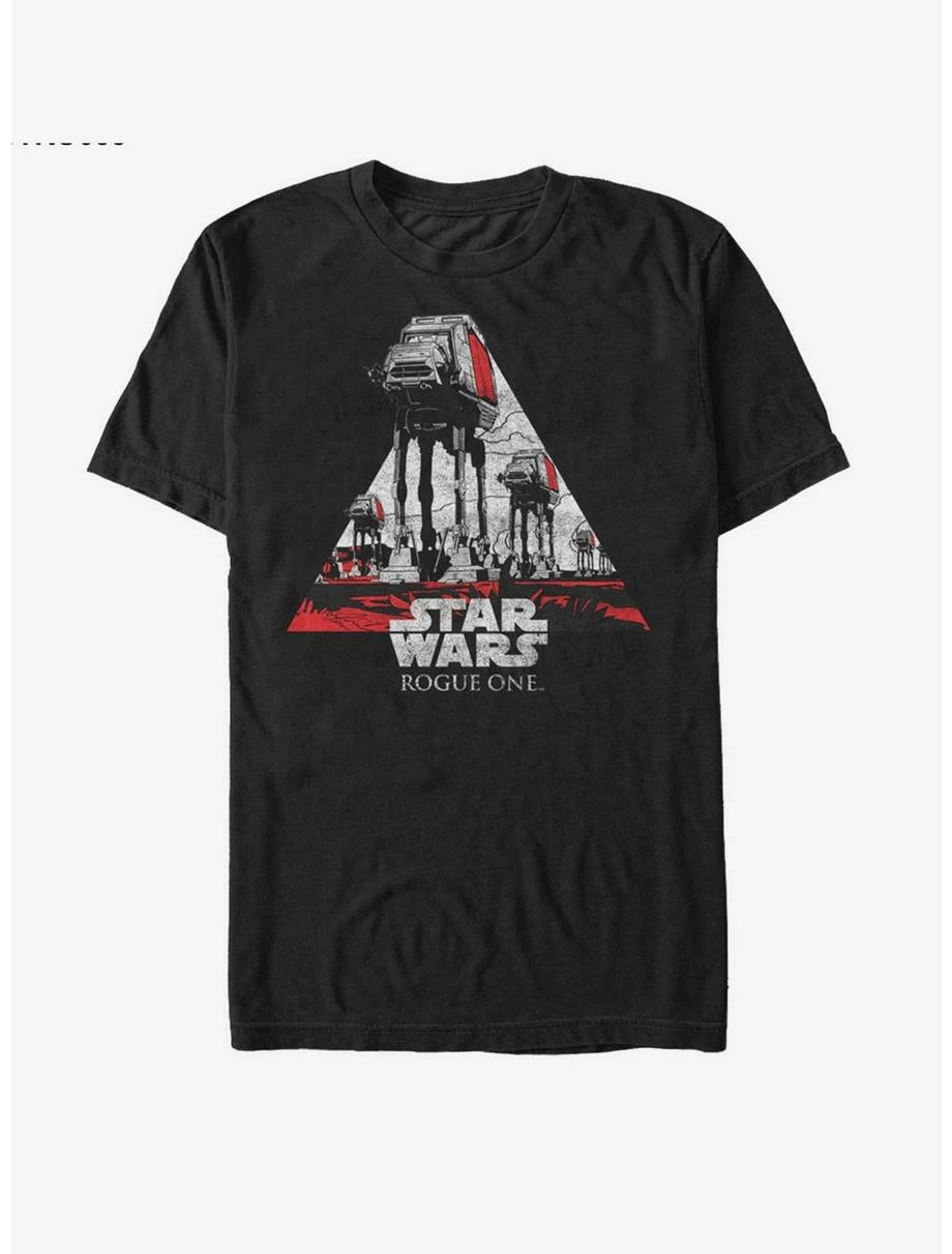 Watch out! The Star Wars Rogue One AT-ACT Pyramid Approach Black T-Shirt is heading your direction! Several All Terrain Armored Cargo Transports are featured in a distressed print, bordered by a triangle, walking across this awesome black AT-ACT shirt. 100% Cotton.