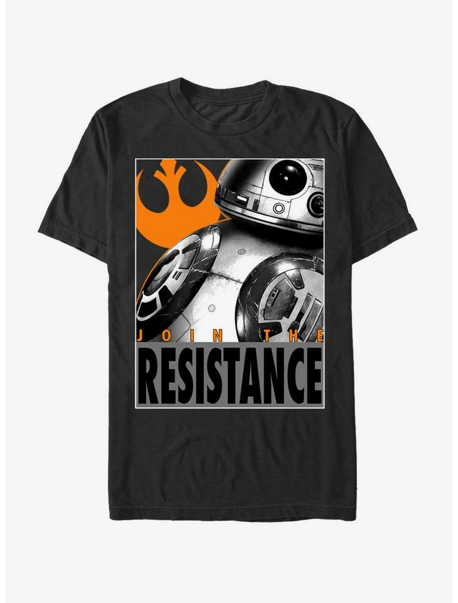 Join Rey, Finn, and Poe on their quest to defeat the First Order with the Star Wars BB-8 Join the Resistance Black T-Shirt! BB-8 and the Resistance emblem are printed above bold letters that read “Join the Resistance” on the front of this cool black BB-8 shirt. 100% Cotton.