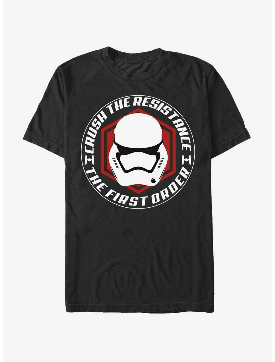 Climb into your TIE Fighter and prepare for battle with the Star Wars First Order Crush the Resistance Black T-Shirt. A Stormtrooper helmet is printed with “Crush the Resistance The First Order” on the front of this classic black Star Wars Episode 7 shirt. 100% Cotton.