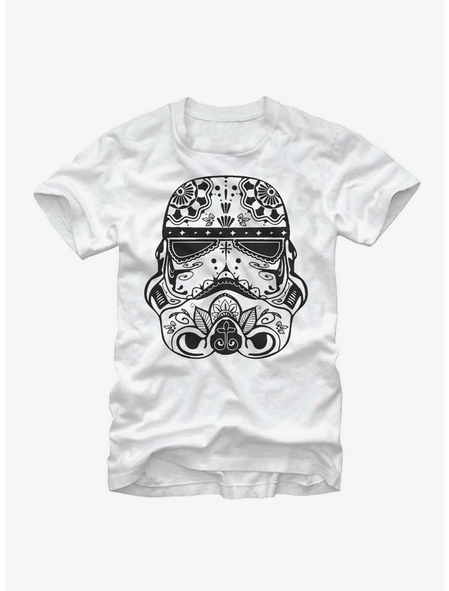 The stormtrooper helmet has come to be a symbol of evil and villainy, but it’s looking rather lovely on the Star Wars Ornate Stormtrooper White T-Shirt. This durable white shirt features an artistic and ornate print of the iconic stormtrooper helmet, giving it a Day of the Dead twist. 100% Cotton.