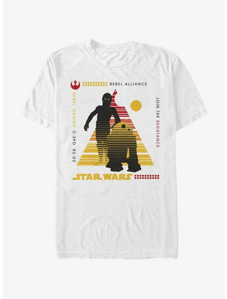 Lucky for you, these are the droids you’re looking for on the Star Wars Rebel Droids White T-Shirt! C-3PO and R2-D2 are shown in a cool striped pattern on this fun white Star Wars shirt. 100% Cotton.
