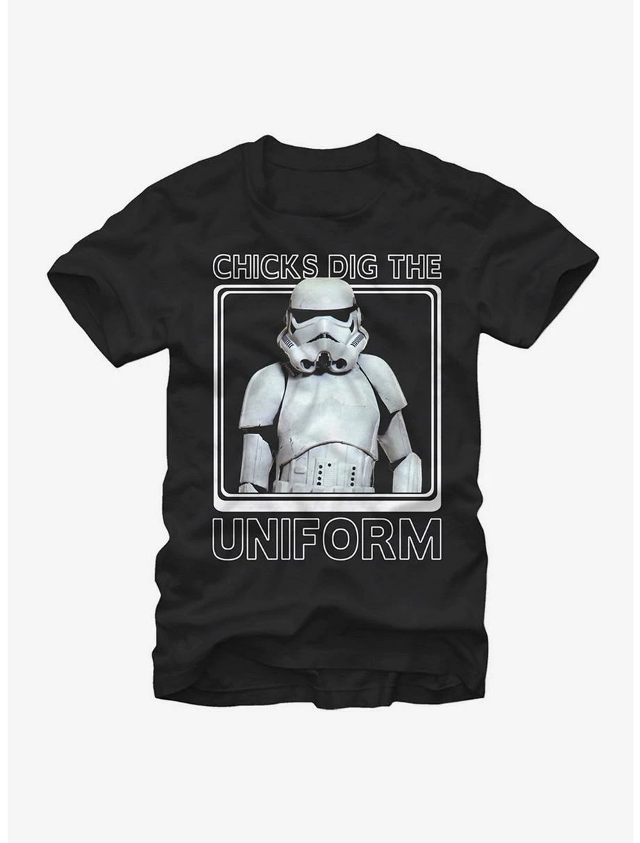 Enjoy the perks of being a foot soldier for the Galactic Empire with the Star Wars Stormtrooper Chicks Dig the Uniform Black T-Shirt. A stormtrooper in slightly battle-worn armor poses next to “Chicks Dig the Uniform” printed on the front of this funny Star Wars shirt. 100% Cotton.