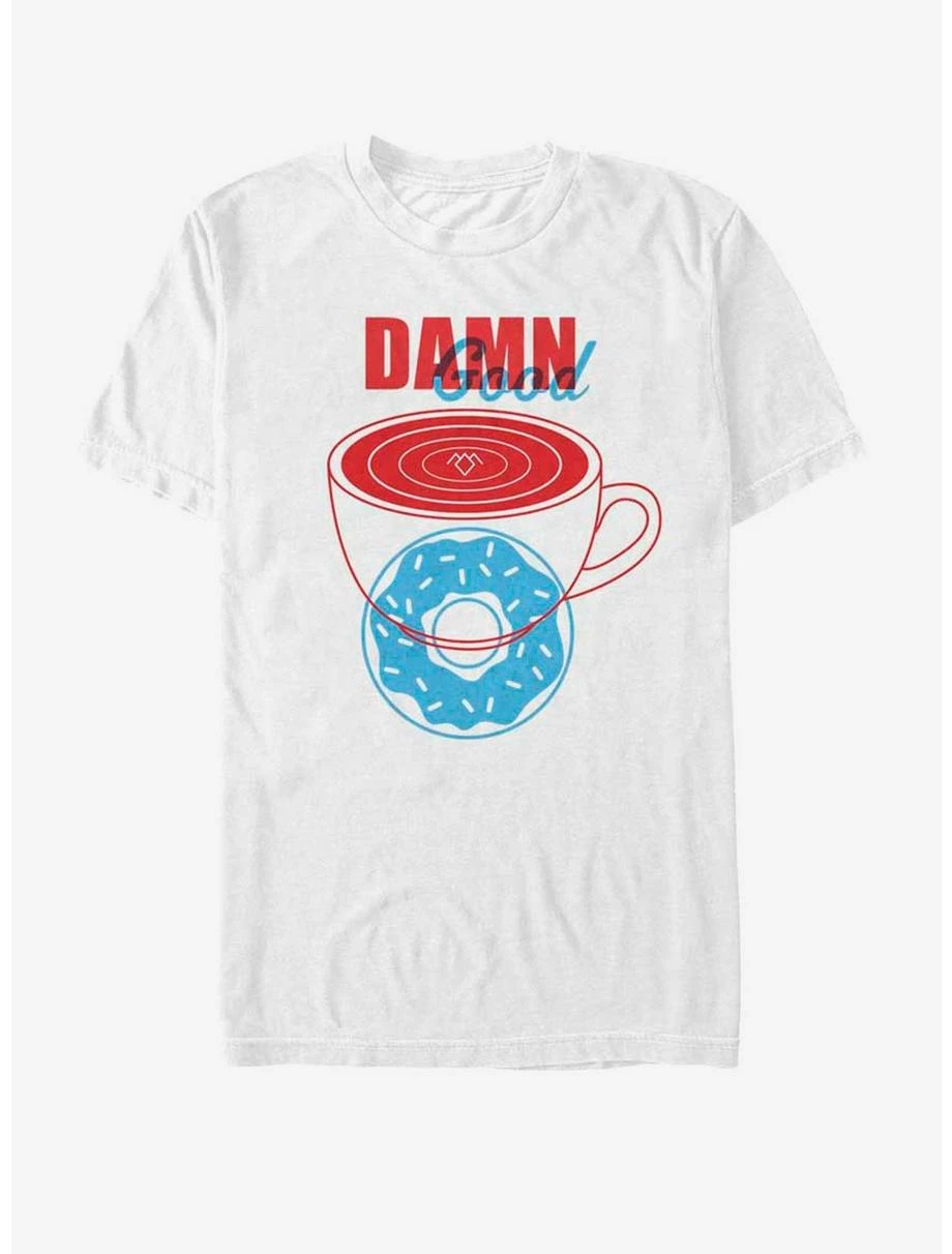 You know that Agent Cooper can’t resist a fine cup of coffee or a donut, but did you know that he can’t say no to the Twin Peaks Good Coffee and Donut White T-Shirt either!? A sleek coffee cup and donut are printed in blue and red beneath “Damn Good” on this funny white Twin Peaks shirt. 100% Cotton.