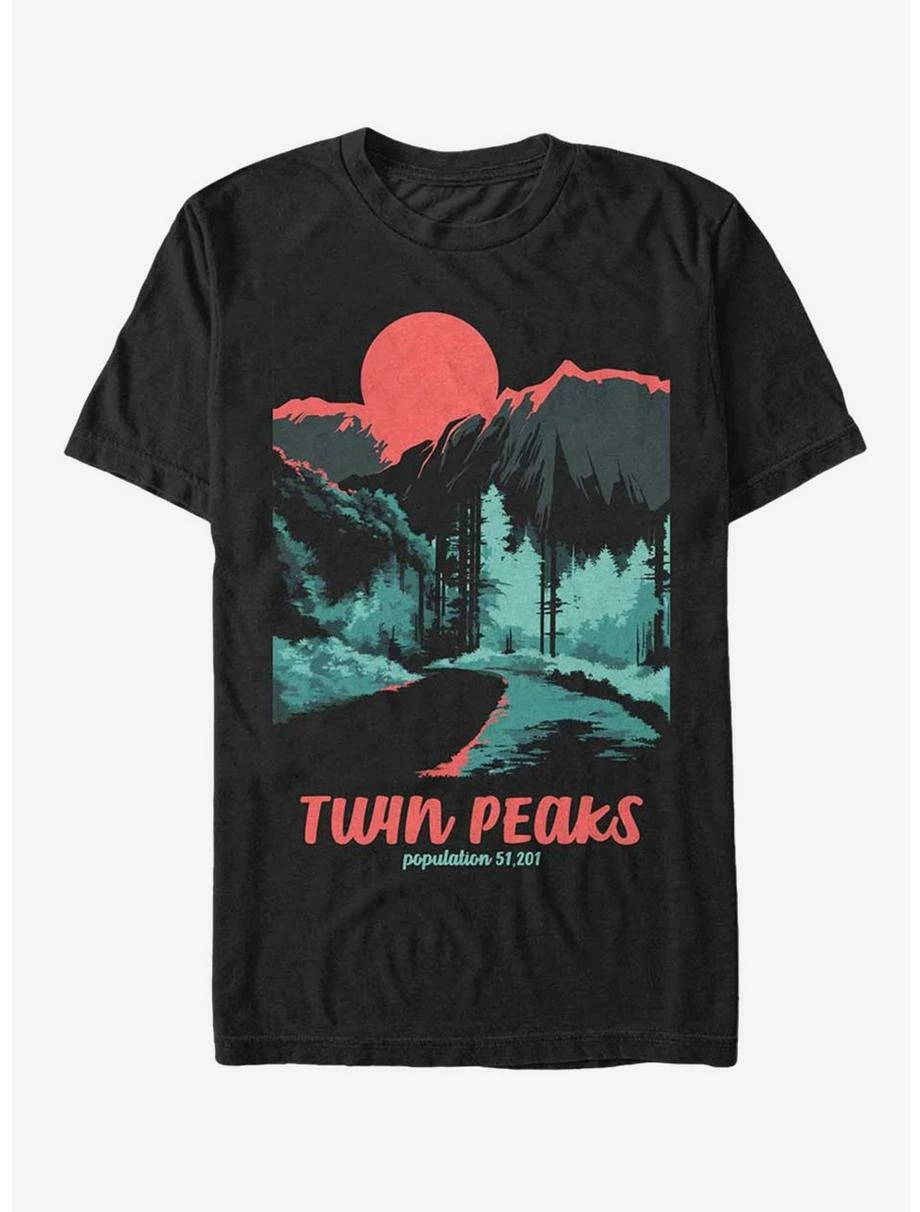 Don’t be fooled by the serene beauty of Twin PeaksΓΒ’Γ’βΒ¬ΓΒ¦there’s more than meets the eye like on the Twin Peaks Population Black T-Shirt! A scenic mountain view is printed in an eerie green and orange with “Twin Peaks Population 51,201” across the bottom on this cool black Twin Peaks shirt. 100% Cotton.
